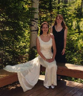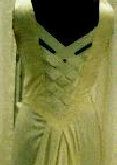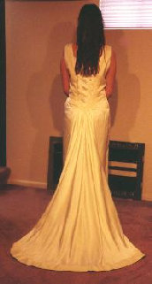 This is the first wedding dress I created. The fabric is 100% tussah silk satin with contrasting silk woven in a box pattern. It is a sheath dress with attached flared train. The back (see detail) is woven strips of fabric to create the lattice effect. The contrasting fabric is found on the shoulders, the front neckline, down the front of the dress, and at either side of the lattice on the back. The design came from a drawing the bride made.